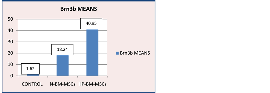 Figure 10. Diagram of Brn3b expression on control group, N-BM-MSCs group and HP-BM-MSCs group. Brn3b expression means on control group 1.167 ± 0.592; N-BM-MSCs group 18.245 ± 4.910; HP-BM-MSCs group 40.950 ± 9.431.