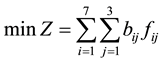 Table 2 shows the amount of grain and oil supplies of seven employment warehouses, the lowest grain and oil supplies requirements of the three grain and oil reserve stations, and the unit transportation costs of transporting unit suppliers from a deployment warehouse to a reserve station.