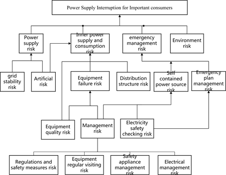The second level is the direct performance factors of important power supply interruption risk, including power grid supply risk, internal power supply risk, emergency control risk and natural environmental risk. Power grid supply risk and internal power supply risk will affect the power transmission from external and internal perspective, the lost of either will cause power supply accident to