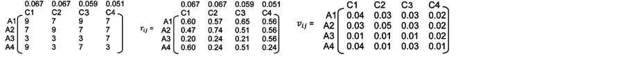Figure 3. Decision matrices. (a) decision matrix; (b) normalized decision matrix; (c) weighted normalized decision matrix.