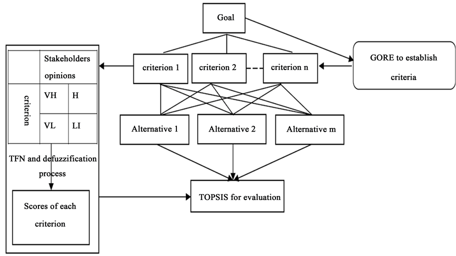 First of all we have to explore different alternatives during GORE and for this we use goal models obtained during GORE. AND/OR diagrams which are the essential output artefact of these goal models are used in the exploration phase of alternatives. Once we found different alternatives, we need to evaluate these alternatives to select the best one. The alternatives are compared based on the weighted criteria. The criteria are weighted using fuzzy numbers and stakeholders opinions are taken as input and then converted to fuzzy numbers. By using the fuzzy numbers we can convert the qualitative information of stakeholders into quantitative one. The proposed methodology consist of following steps and is shown in Figure 1.