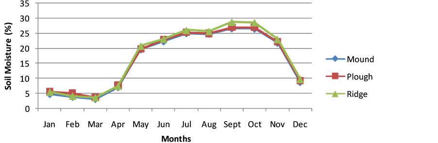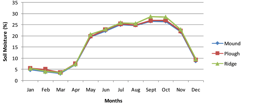 The lowest soil moisture content observed in plot under mound tillage may not be unconnected with the findings of [11] . Heat circulates within each heap of the mound tillage thus raising its temperature but horizontal transfer of heat occur in ridge tillage and so cooler than mound tillage. The implication of this is that evaporation is higher in mound tillage hence lowest soil moisture was reported under this tillage system.