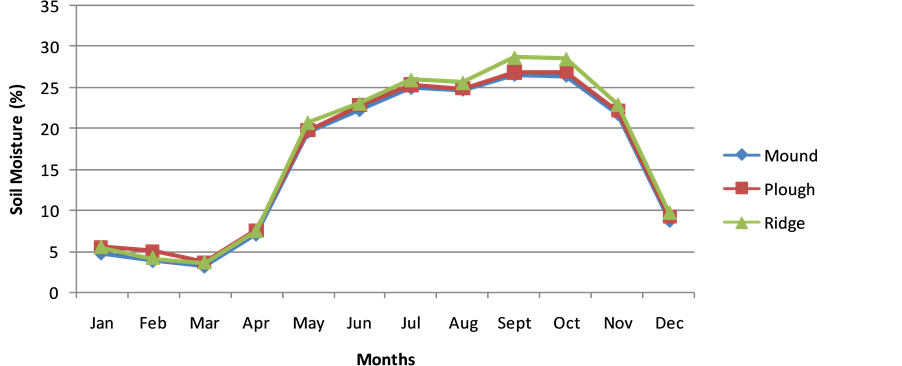 Ridge tillage became the wettest followed by plough and mound tillage systems. The exception of this is the month of March and April when plough system still retained highest value of 3.68% and 7.61% (see Table A4).
