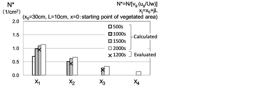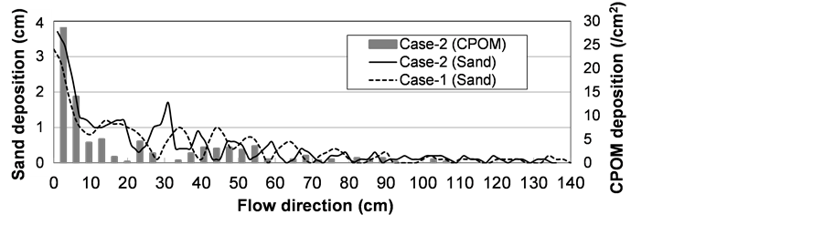 Figure 5 shows comparison of deposition thickness of sand and CPOM between Case-1 and Case-2 at 1200 seconds after the experiment starts. We observed that sand deposition was occurred even upstream of the beginning of vegetation area in both of cases, and sand was deposited into wavelike fashion along to longitudinal direction. It was judged “ripples” by the figure in the book of Yalin (1977, [5] ) which are prepared by overlaying the formation area of ripples and dunes on Shields diagram. Ripples were formed by sediment transport and propagated to downstream with time progress. In contrast, CPOM had never deposited when it was transported by itself in vegetated area. However it was captured and deposited with the progress of ripples due to the both of interactions. The 77% of all CPOM supply was deposited in vegetated area with sand deposition.