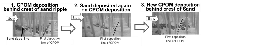 The CPOM deposition mechanism with sand is as follows; 1) firstly fine sand forms ripples; 2) CPOM is deposited behind the crest of ripple, and then, fine sand is deposited and covered on CPOM deposition; 3) finally new CPOM is coming and deposited behind shifted crest of ripple. These steps are then repeated. In Figure 5, we can confirm that CPOM deposition is increasing and propagating with the development of ripples. CPOM deposition amount was measured at representative point in vegetated area as shown in Table 2. By measuring each parameter of ripples at measuring section