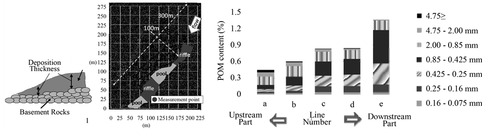 Deposition characteristics of POM with sand particles was estimated by measuring the topography of sandbar and the thickness of sediment deposition layer, observing the spatial distribution of vegetation, and analyzing the grain size distribution of deposited sediments and the quantity of POM contained the deposited sediments. The thickness of deposition layer was measured as the height from the top of basement rock to the top of fine sand layer by using a soil auger at 15 locations in the target sandbar (see Figure 1).