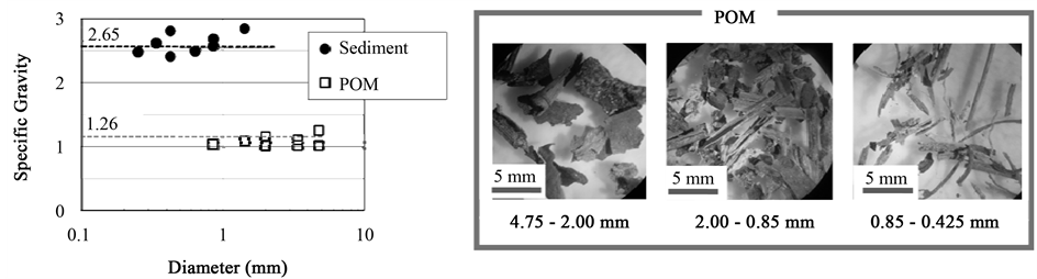 POM content ratio to the total samples included in the sediment was distributed from 0.5% to 1.5% at each pointthrough longitudinal direction of sandbar. In addition, specific gravity of POM was observed in a laboratory. POM is classified into CPOM and FPOM according to their sizes. The criterion is 1 mm. We here focused on POM finer, which have less than 5 mm of particle diameter such as vegetation seeds and litters. Figure 2 shows that the specific weight is distributed from 1.02 to 1.26 for POM while it is around 2.65 for sand. The movement of POM in settling process is completely different from sediment. Sediment was settled rapidly in a group however POM moved flutteringly and settled slowly from top to the bottom of water. It is clear that the settling process of sediment and POM is differed even if they have same diameter.