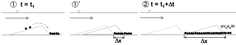 The Equation (1) is consisted of two kinds of important factors of bed load motion such as sediment number density