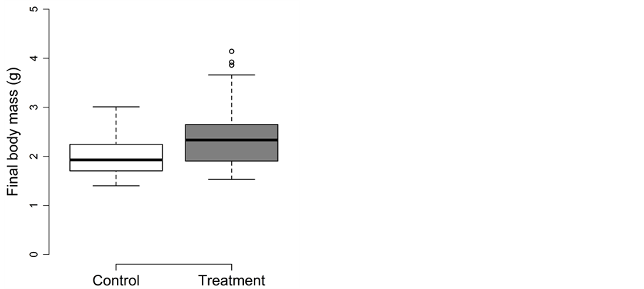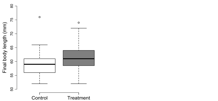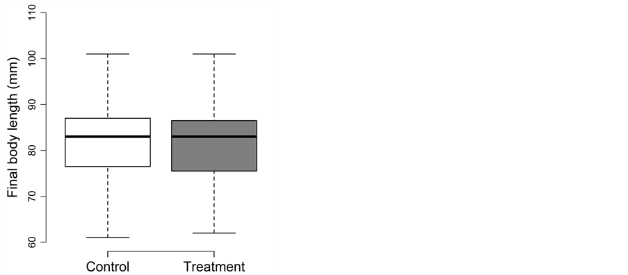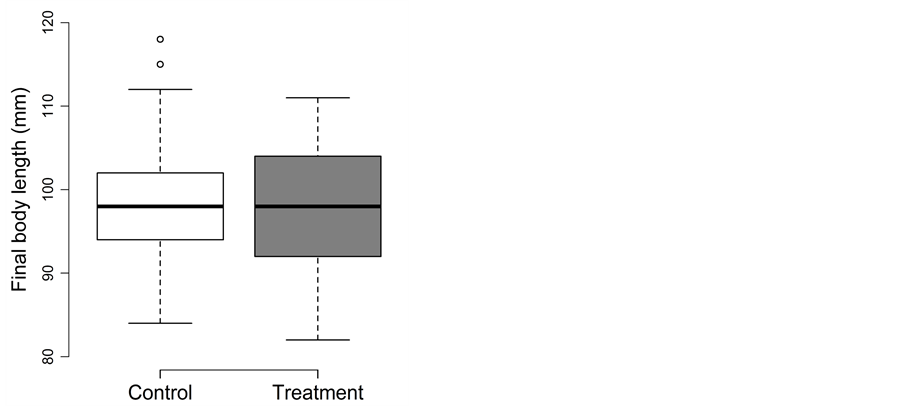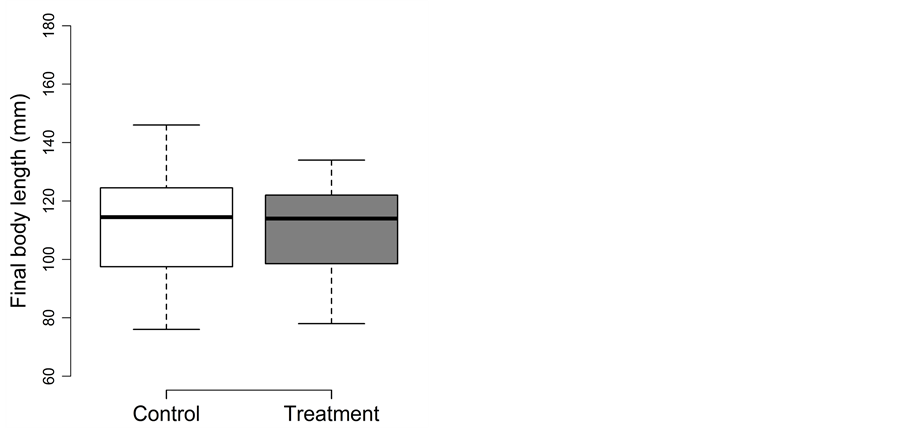 For final body length, treatment could be removed from the full model (p = 0.83). Thus, final fork length did not differ between the control (82 ± 9 mm) and treatment (81 ± 8 mm) (Figure 3(a)).