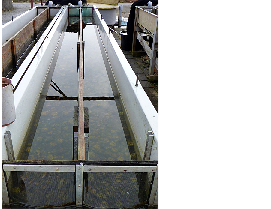 The juvenile Atlantic salmon used in these experiments were hatched from eggs originating from the local River Imsa and reared at the research station. One week prior to stocking into experimental channels, all fish were anaesthetized with benzocaine and length (fork length; in mm) and wet mass (in g) measured (scale type UWE-NJW-150, precision: ±0.005 g). The first experimental bout was the trapping experiments, where the fish were individually tagged with PIT-tags (length 13 mm; diameter 2 mm; Oregon RFID, U.S.A.). During the summer trapping experiments fish got fungi infection (Saprolegnia sp.) and consequently no PIT-tagging was done in the following beaching experiments in order to avoid these problems.