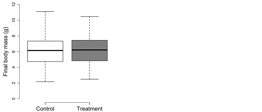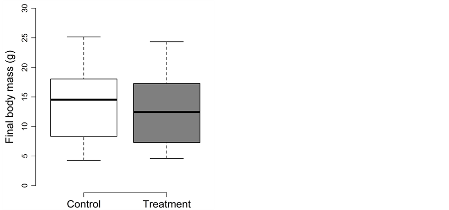 For final body fat, treatment could be excluded from the full model during model simplification (p = 0.12), leaving only final body mass in the final model (0.11 ± 0.02; t = 7.3; adjusted p < 0.0004). The fat content changed from a pre-experimental 10.1% ± 2.2% to 7.4% ± 1.2% in the control and 7.5% ± 1.2% in the treatment.