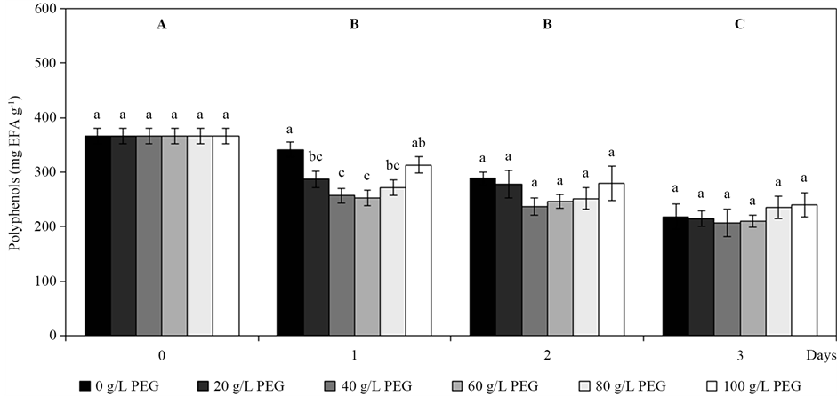 Figure 4. Effect of water stress induced by PEG-6000 on polyphenol contents in germinated seeds of Achtar variety, during 3 days of germination. Values (means of three replicates ± SD) with distinct letters are significantly different at 5 % (Tukey’s test). Upper-case letters indicate significant differences depending on time.