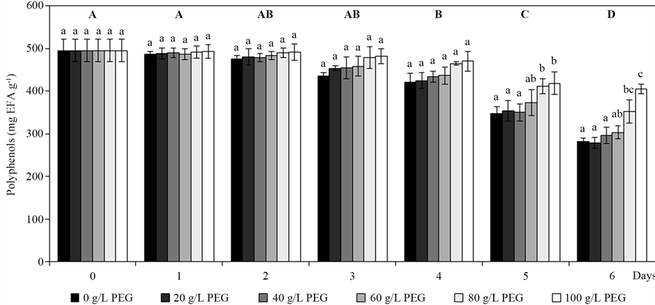 Figure 3. Effect of water stress induced by PEG-6000 on polyphenol contents in germinated seeds of Tigre variety, during 6 days of germination. Values (means of three replicates ± SD) with distinct letters are significantly different at 5% (Tukey’s test). Upper-case letters indicate significant differences depending on time.