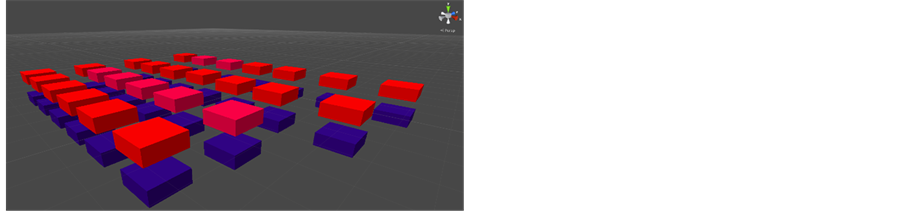 We placed 26 pairs of fictional game objects (blue and red cubes) to overlay left and right virtual boundaries on the cardboard boxes in the real world. The initial state of the game space are shown in Figure 5.