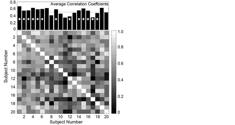 Figure 2. Correlation coefficients of z-scored subjective responses. The bar chart illustrates the correlation coefficients averaged over the subjects. The subjects participated in the experiment twice are marked with stars.