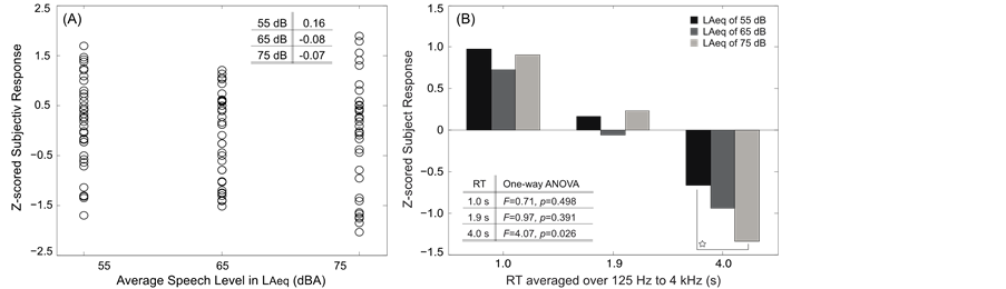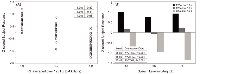 Figure 3. (A) Z-scored subjective responses as a function of reverberation condition. Averaged values of the responses for each reverberation condition are tabulated inside the figure; (B) Z-scored subjective responses as a function of reverberation condition for three speech levels. Black color is the responses collected for T20 of 1.0 s. Dark gray color is the responses collected for T20 of 1.9 s, and light gray color is the responses collected for T20 of 4.0 s. A one-way analysis of variance (ANOVA) is executed on the z-scored subjective data and reverberation conditions. Results of a one-way ANOVA are tabulated inside the figure.
