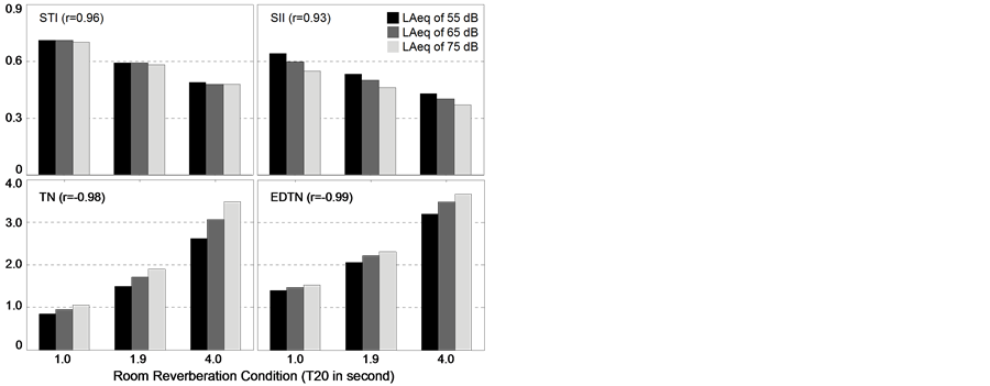 speech level. SII variesal most equally for the change of speech level in three reverberation conditions, but the loudness-based parameters change more in higher reverberation conditions. In other words, STI and SII do not explain the significant difference in the subjective response that is only observed between speech level of 55 dB and 75 dB at T20 of 4.0 s (see Figure 4(B)). Because TN and EDTN more accurately model the masking effect of speech level varying with reverberation conditions, values of these parameters better correlate with subjective intelligibility than do STI and SII (see the averaged correlation coefficient values given in Figure 5). Some of parameters specified in ISO 3382-1 [1]―T20, EDT, C50 and D50―were also computed and compared with the subjective data. T20 and EDT yields a correlation coefficient of r = 0.97 with the subjective data, which is slightly higher than STI. C50 and D50 also highly correlate with intelligibility (r = 0.96).