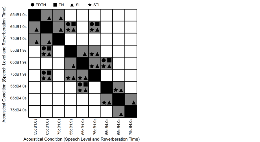 More analyses were performed to find acoustical conditions where subjective speech intelligibility is significantly different, and parameters that accurately predict such conditions. For this, the subjective responses were grouped into nine acoustic scenarios (3 reverberation conditions and 3 speech levels), and a Tukey/Kremars post hoc test was executed. Results are shown in Figure 6, of which x-and y-labels represent speech level and T20. White color indicates pairs of conditions where intelligibility is significantly different at a confidence level of 90% and gray color indicates pairs of conditions where speech intelligibility is subjectively indistinguishable at the same confidence level. As seen in Figure 6, “55 dB 1.9 s” and “55 dB 4.0 s” have subjectively same intelligibility as “65 dB 1.0 s” and “65 dB 1.9 s”, respectively. This indicates that increasing speech level by 10 dB and shortening a room’s reverberation by T20 of 0.9 s or 2.0 s seem equally beneficial to intelligibility (albeit the former is considerably more labor and cost effective than the latter in most situations). However, this trend is not observed when speech level is 75 dB. For example, the subjective responses at “75 dB 1.0 s” and “75 dB 1.9 s” have significantly different mean values to those at “65 dB 1.9 s” and “65 dB 4.0 s”. Furthermore, it is hard to explain why “75 dB 1.9 s” has intelligibility equal to “65 dB 1.0 s”.