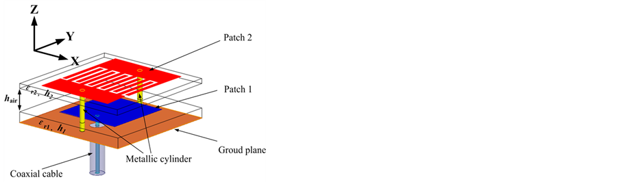 , connecting to the ground though two metallic cylinders. In our designs, the planar microstrip patch antenna (MPA) was chose as the driven element. This is mainly due to the advantage of its integrated ground plane and easily to be fixed on other platforms.
