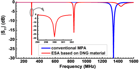 Figure 4. HFSS-predicted |S11| values versus frequency for conventional MPA and proposed ESA based on DNG metamaterial.