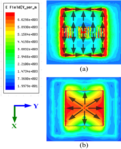 Figure 7. HFSS-predicted E-field distribution on (a) the upper layer and (b) nether layer of the proposed ESA operating at 299.6 MHz.