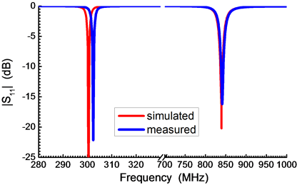 The measured reflection coefficient of the proposed antenna is plotted in Figure 9 along with that calculated via full-wave simulation by the HFSS. The measured resonant frequency is about 1% shifts higher than the simulated one, which can be contributed to fabrication process and dielectric constant tolerance in a frequency regime. The 3 dB fractional bandwidth (FBW3 dB) is 1.5 MHz extended from 301.59 MHz to 303.20 MHz, 19 MHz extended from 832.26 MHz to 851.26 MHz, corresponding to fractional bandwidth of 0.5% and 2.3%, respectively. The narrow bandwidth demonstrated that the high quality factor (Q) and strong resonance characteristic of the electrically small antenna. Enhanced bandwidth would be obtained by introducing a NIC circuit based on non-Foster element.