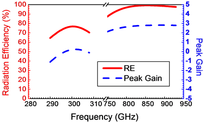Figure 11. Measured radiation efficiency and peak gain of the proposed antenna.