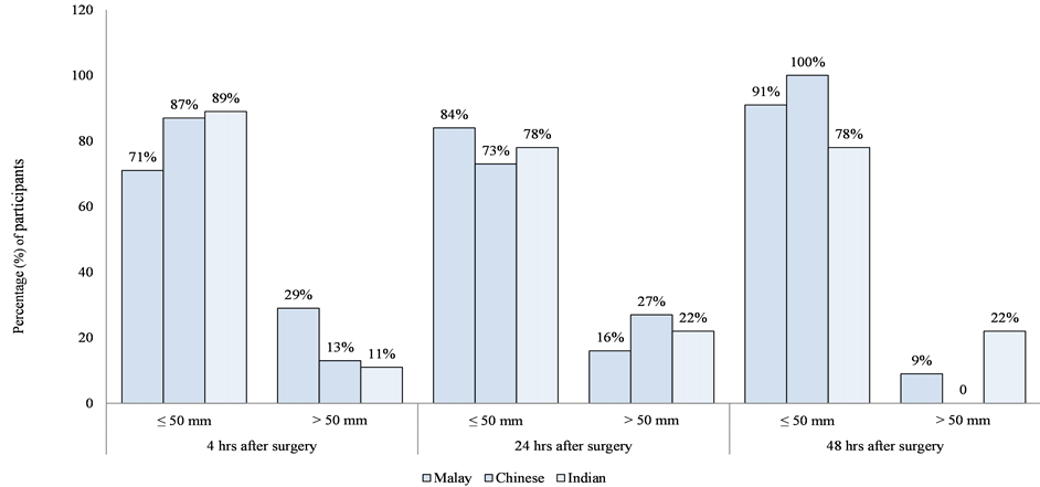 Pain scores were assessed at 4, 24, and 48 hours post-operation (Figure 1). During these three post-operative periods, more than 50% of the patients in all ethnic groups experienced pain scores of 50 mm and less. The number of patients who experienced pain that elicited scores of more than 50 mm decreased with time.