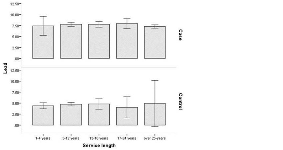 Accounted by correlation method blood lead level and service length had a weak dependence (r = 0.347) and statistical significance (p = 0.015) in a random sample group on mining place. As of working condition index was r = 0.4 or an average dependence that is statistical significance (p = 0.007) (Figure 2).