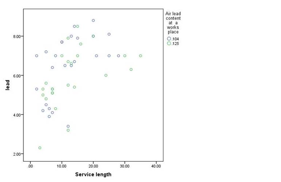Figure 2.Correlation blood lead level of random sample group to service length air born lead content at a works place.