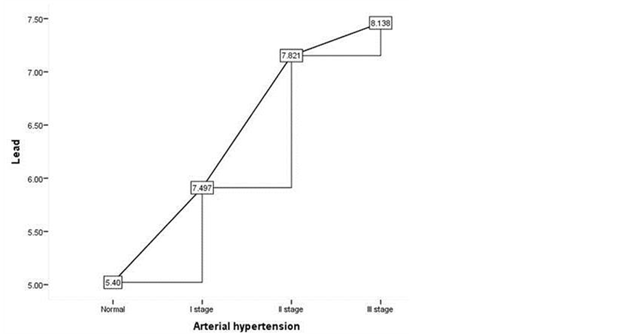 Correlation of arterial hypertension (AH) and blood lead content was calculated using non-parametric and Spearman ranking correlation factor. Blood lead content level had intense influence on higher diastolic and sys-