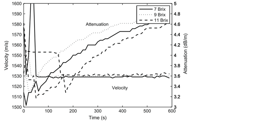 Figure 6. Ultrasonic measurements of coagulating tofu gelsunder traditional heat treat- ment [3]: calcium sulphate, 1.0% w/w; induction temperature, 75˚C.