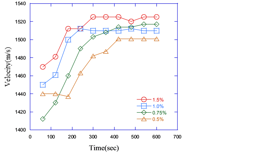 Figure 6 shows ultrasonic measurements of ultrasound waves travel in coagulating tofu gels under traditional heat treatment [3]. Its velocity profile is contradictory to the above statement. This is because, in traditional heat treatment, the formation of tofu gels (clusters and air bubbles) alters the molecular structure and intermolecular interactions [4] and hence the elasticity changes in a dramatic degree because of the presence of airbubbles.