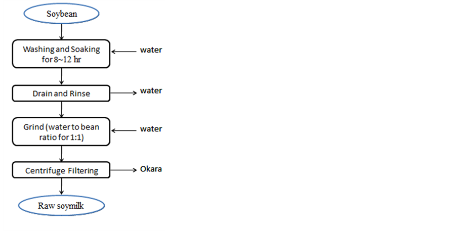 Washed soya beans (800 g) were soaked for 8 - 12 hrs at a constant temperature (30˚C) in reverse osmosis (RO) water. One time by weight of RO water was added to the equivalent dry weight of the soya beans. The mixtures were ground and centrifugally filtered for 2 min to remove the residue. The soya milk produce was adjusted to a concentration of 10˚ Brix. The procedure of preparing soya milk is summarized as Figure 1.