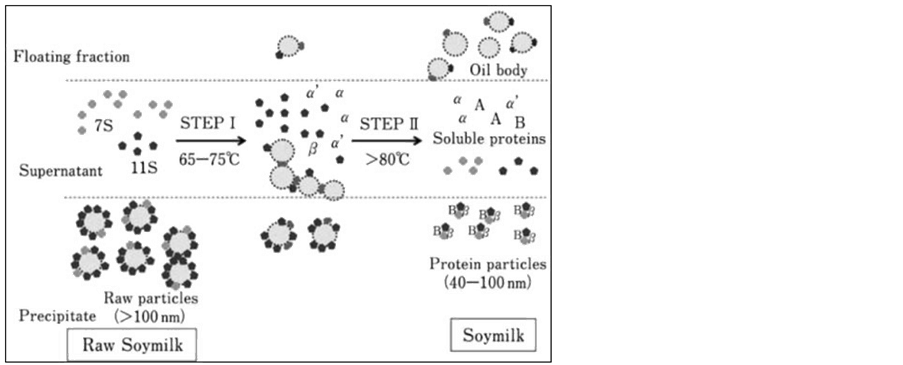 Figure 2 depicts the mechanism of soya milk transforming to tofu gels. When soya milk is heated to 65˚C and beyond, the oil body is released. This is the first step of transformation. The 7S and 11S proteins will escape from the subunits at 75˚C and 80˚C, respectively. Subunits are surrounded by protein particles with a size of 100 nm [11]-[13]. The transformation completes.