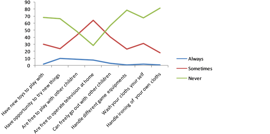 The results showed that 2.2% of the respondents reported that within the last six months, they always had new toys to play with, while 30% reported that sometimes, they had new toys and 67.8 % reported that they were never provided with toys to play with. In enquiring into the frequency with which their parents exposed them to new experiences in various dimensions, the responses were very revealing; as is shown in Table 1, Figure 1 and