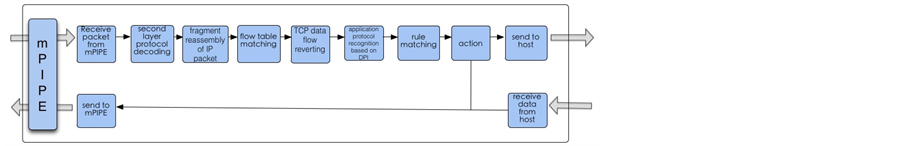 Packet processing module, which is based on the software architecture of Suricata, processes the packet received from mPIPE. Then sends it to packet forwarding module through PCIe, and sends the results to the upper layer application after processing. The process is shown in Figure 2.