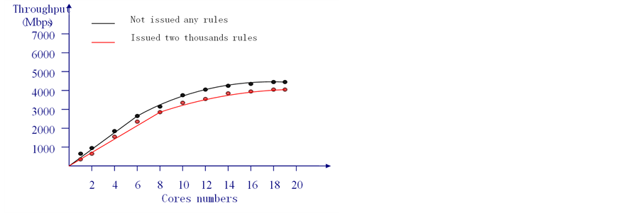 Results of the throughput statistics is shown in Figure 4. As can be seen from the figure, whether issued rules or not, to the first eight cores, the system flow processing grows approximately linearly with the numbers of cores. While along with the numbers continue to increase, the curve is no longer linearly but declined. That is because thread locks have a great impact on performance in multithreaded. In circumstance when the system restricts two thousands rules, the data flow handled by system reaches approximately 4 Gbps.