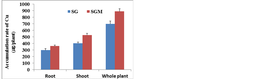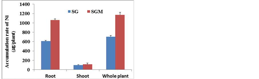 Compared to the SG treatment, SGM gave promotion to heavy metal accumulation rates in the whole plant, with increasing rates of 45% (Pb), 66% (Ni), and 27% (Cu), respectively. For Pb and Ni, the accumulation increase was almost from root, whereas for Cu, the increase was from both root and shoot (Figure 2).