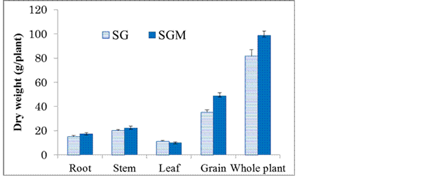Sorghum in each pot grew well with green colored leaves, and no visible physical damage showing toxicity symptoms was found at all plants. As shown in Figure 1, the total biomass dry weight of individual sorghum plant for SG and SGM treatments were 81.5 and 98.6, while the grain biomass were 35.2 and 48.9 g/plant, respectively. Microbe inoculation showed 21% increase in total biomass production and 44% in grain production. SGM treatment also showed some increasing effect on root and stem biomass, however, no positive effect was found in leaves.