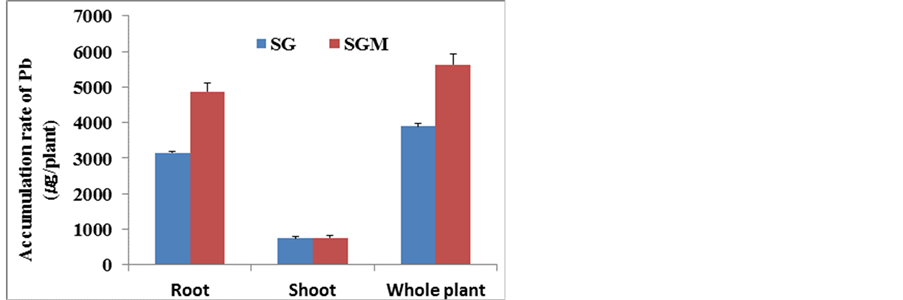 In the process of phytoremediation, heavy metals are removed from soils by harvesting plants. So, phytore- mediation potential of plants to soil heavy metals is generally decided by the heavy metal accumulation amount of plants from soil during one harvesting cycle. The mean values of accumulation rates (phytoremediation potential) of Pb, Ni and Cu by individual sorghum plant are shown in Figure 2. Results showed that in the SG treatment accumulation rates of Pb, Ni and Cu by the whole plant of sorghum were 3900, 705, and 700 μg/plant, respectively. Results also showed that 81% of Pb and 86% of Ni were accumulated in the roots, respectively. Unlike Pb and Ni, only 42% of Cu was accumulated in the root, indicating Cu had much higher translocation rate from root to shoot than Pb and Ni. Mohebbi (2012) also reported that Cu had higher translocation rate than Pb in alfalfa [14]. High translocation rate from root to shoot were important for phytoremediation as the heavy metals was uptake to the easily harvestable plant parts i.e. shoot.