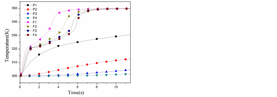 In order to compare the melting process in different units, four representative points (F1, F2, F4 and F5) of 70% porosity model and four points (P1, P2, P3 and P4) of pure paraffin are chosen as observation points who are located in the center of each cube unit. Their temperature curves are shown in Figure 7. The point F4 which is farthest from the heat surface is heated in the beginning. The temperature curves of all four points of 70%