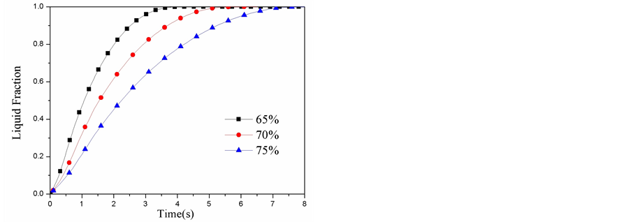 Because high mechanical foams have a better performance in energy storage systems than high porosity foams, three different porosities (65%, 70% and 75%) of high mechanical property foams are analyzed. Their liquid fraction curves of different porosities are shown in Figure 9. From these three curves, the different melting times can be easily observed. The melting time increases with the increase of foam porosity. Therefore, for lower foam porosity, the extra aluminum helps transfer the heat from heat resource to the paraffin, but the heat storage amount reduces as a consequence of the decreased volume fraction of paraffin.