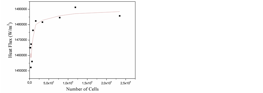 conductivity is according to the reference [4]. The model is placed in the condition that the temperature gradient is 1 K. The heat flux density will approach a constant number when the system arrives at steady state. Therefore, by using the Fourier law, the thermal conductivity could be obtained. The model grid used in this analysis is the tetrahedral mesh. In order to confirm the grid number, the model with different grid numbers is simulated at the condition discussed above. The heat flux density of middle surface is detected during the process. Figure 3 shows the heat flux density as a function of grid number. It obvious that the value of the heat flux become steady as the grid number increasing. As a result, considering both the precision and calculate time, the grid number is set to 785,257.