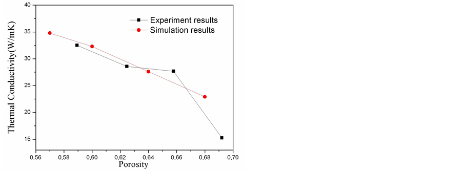 To verify the modified Kelvin model, the thermal conductivities of metal foams are simulated and compared with the experimental results [5]. The aluminum alloys is A356 and their porosities are from 57% - 69%. Figure 4 presents the comparison results. It is obvious that the thermal conductivity decreases as the foam porosity increases. This phenomena is due to the huge different of the thermal conductivity of the aluminum and air. So, the increase of the air volume could lead to the thermal conductivity decrease. Besides, in the compare results, the simulation results are consistent with the experimental ones. Therefore, the modified Kelvin model could be applied in thermal simulations of high mechanical propertymetal foams.