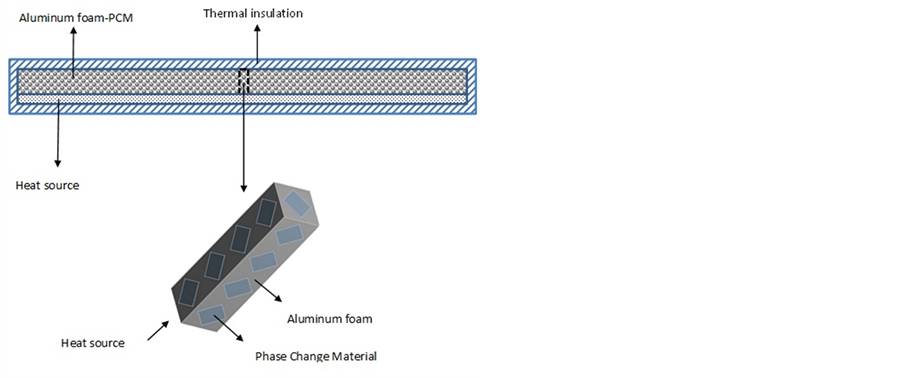 storage system, as shown in Figure 5. The simulations are achieved by ANSYS Fluent® and the heat conduction is solved by the simple algorithm according to the energy conservation equation. The mesh type is tetrahedral and its size is uniform. The dimension of each unit is one millimeter. The aluminum foam is made of AS7G, which is filled by paraffin. Their thermal properties are based on reference [6] [7]. The temperature of the heat surface is 350 K which is higher than the paraffin melting temperature (321 K - 335 K). The other surfaces are insulated. The initial temperature of models is 300 K which makes paraffin in solid state.
