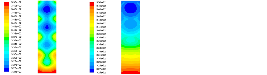 To observe the paraffin melting process, a cross section in the middle of model is selected as observation surface for each model, which is shown in Figure 6. The results of high mechanical property model indicate that the paraffin melts from the interfaces to the center. A similar phenomenon can be observed in the high porosity model, the paraffin begins to melt at the interfaces. Moreover, the temperature of aluminum is always higher than the paraffin. This phenomenon could be explained that the paraffin is not only heated by heat surface, but also heated by the interfaces because of the high thermal conductivity of aluminum.