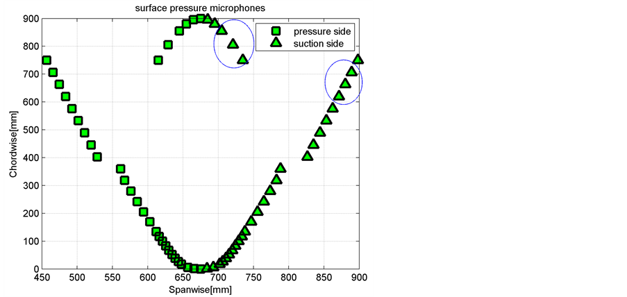 The wind tunnel used for the surface pressure measurements is optimized for aerodynamic performance. Since TE noise signal is difficult to obtain directly, the surface pressure measurements are performed to evaluate the noise source mechanisms [21]. The measurements are performed for a NACA 0015 airfoil, at a flow speed of 50 m/s, and the airfoil chord is 900 mm. The surface pressure microphones are identified with different numbers and mounted on the airfoil surface. The locations of the microphones are depicted in Figure 2. The microphones are placed along the chord direction, e.g., from leading edge to the trailing edge. They are also spread in the spanwise direction to minimize the flow disturbance due to the upstream microphones. Pressure signals from some of these measurement points (Marked with circles in Figure 2) will be compared with LES results.