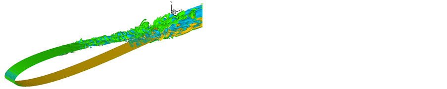 The turbulent stresses in Equation (1) is based on the mix model [18] [19] through Equations (2)-(4) where the first filter is identified with an over bar “-” which relates to the finest mesh. The second filter is denoted with a tilde “~” above. The second filter is also denoted as the test filter, it is computed on a mesh twice as coarse as the finest mesh. In Equation (3), ω is vorticity, Δ = (ΔxΔyΔz)1/3 is the reference filter size based on the grid volume. The model constants are C = 0.04 and α = 0.5.