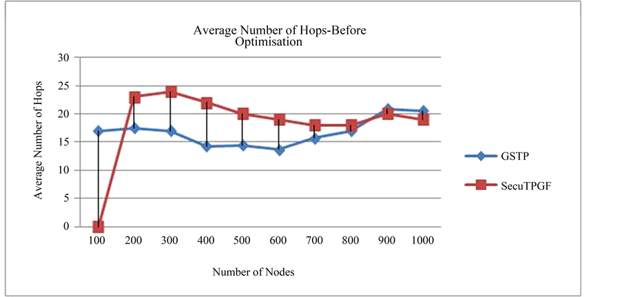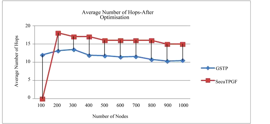 Table 1 shows the simulation parameters used for the simulation. Maximum transmission radius is the important parameter that affects the amount of information received at the base station. Table 2 shows the comparison simulation results of Average number of hops computed before and after optimisation in finding the routing paths using SecuTPGF and GSTP Algorithms.